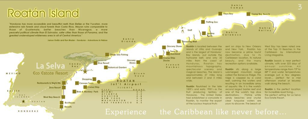 La            Selva is located in the Sandy Bay area, on the west side of the island of Roatan, located in the southeastern Caribbean just 35 miles off the coast of Honduras and east of Belize.